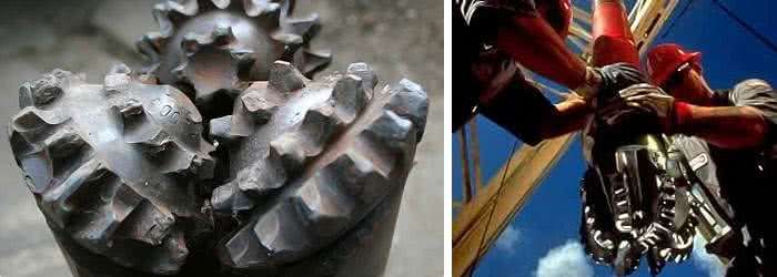 В мерзлом и высокоплотном грунте практикуется шарошечное бурение. Такая колонна заканчивается специальным долотом, состоящим из трех вращающихся полусфер, покрытых зубьями из твердосплавной стали.