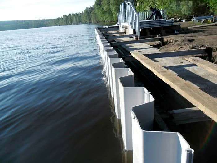 Чаще всего пластик/композит выбирают для укрепления берега и устанавливают стационарно: материал безразличен к воде, герметичен, эстетичен, не ржавеет и не теряет вид со временем.